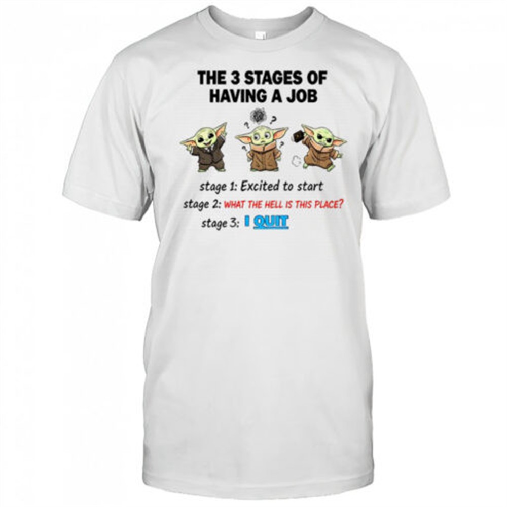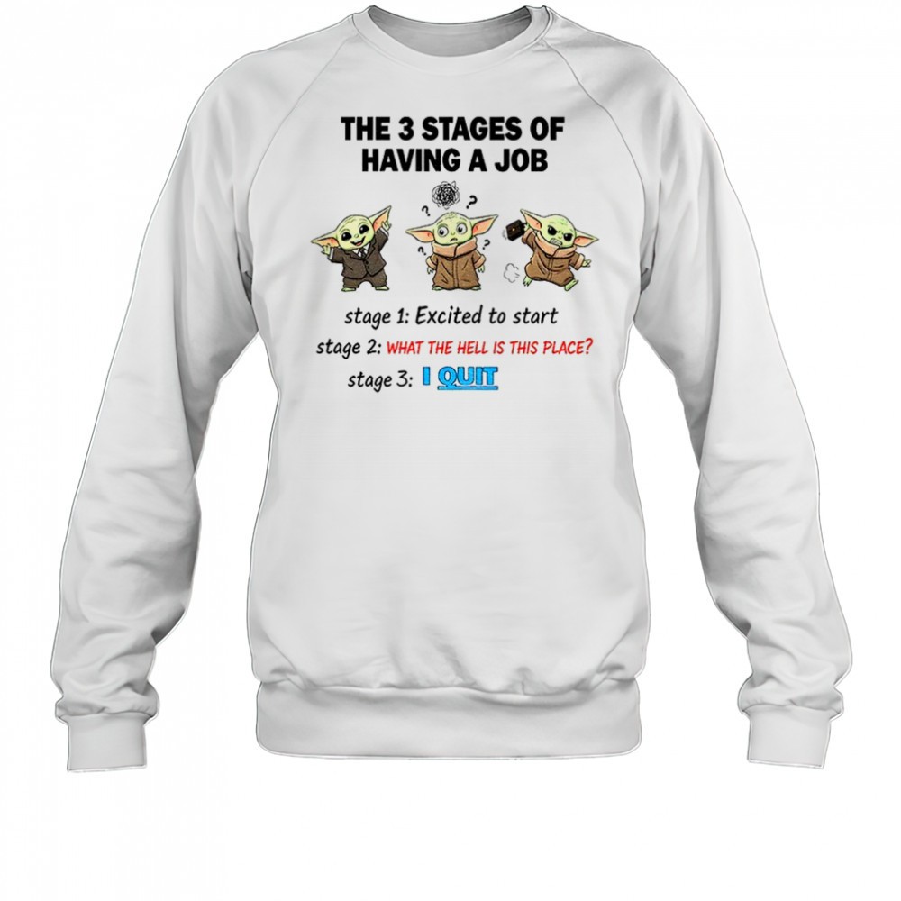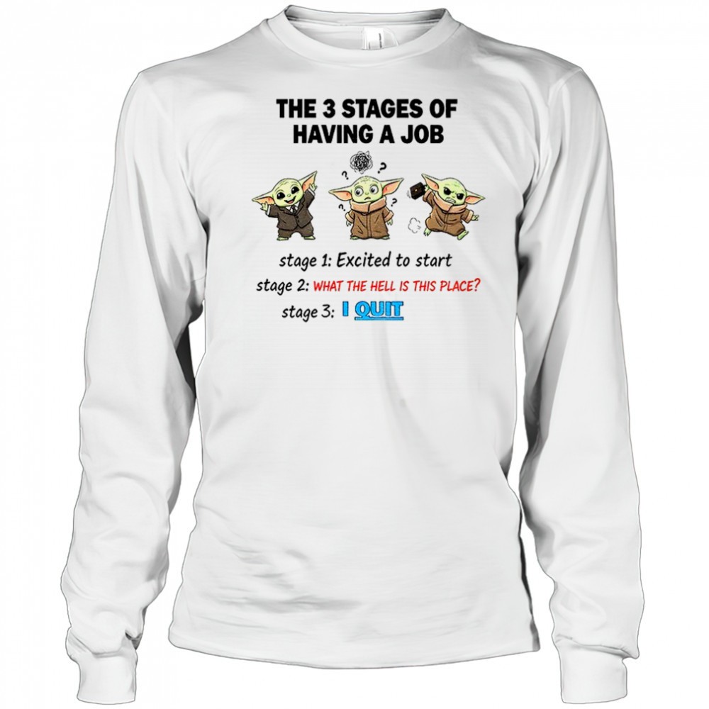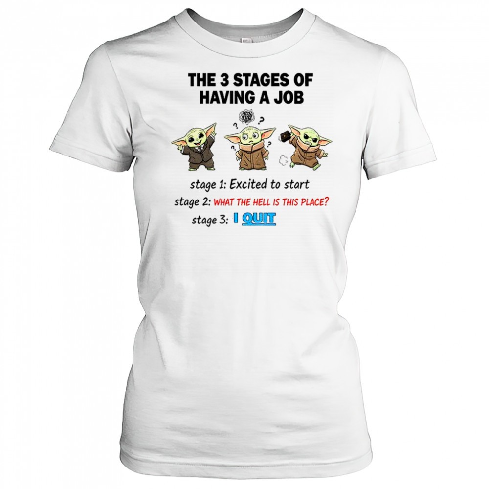Baby Yoda the 3 stages of having a job stage excited to start stage 2 what the hell is this place stage 3 I quit shirt