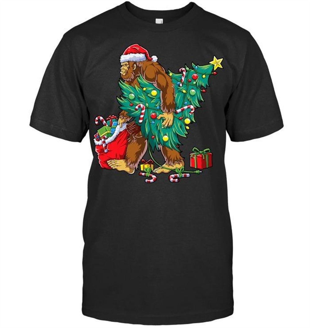 Bigfoot Christmas Tree Lights Xmas Boys Men Sasquatch Lovers T Shirt