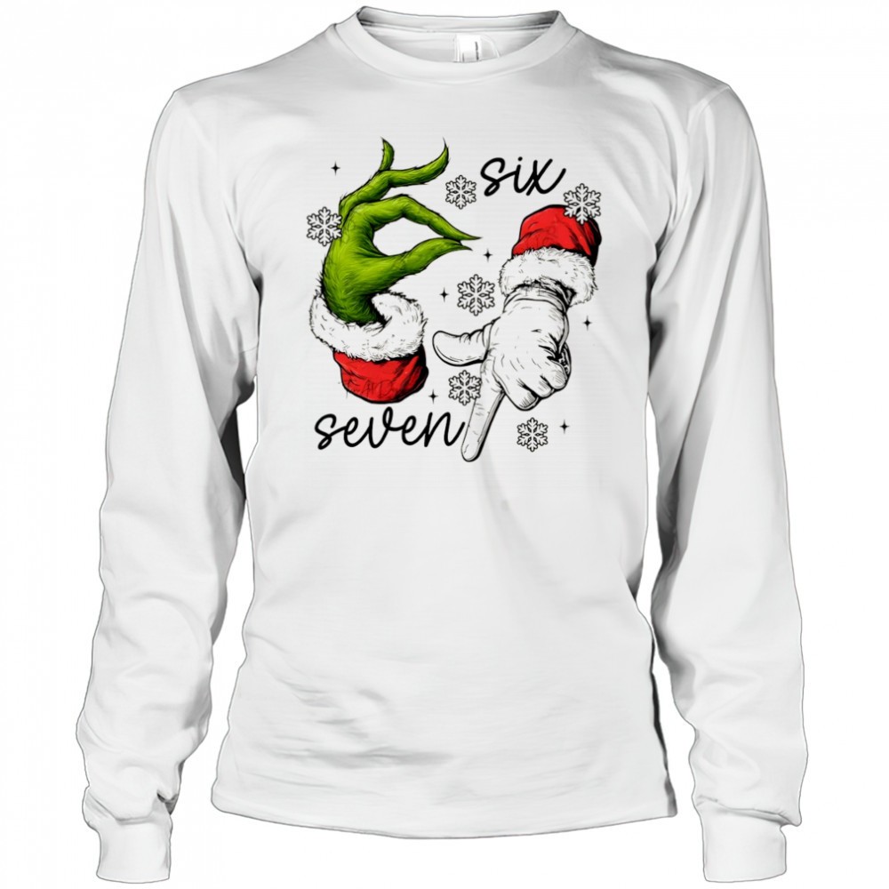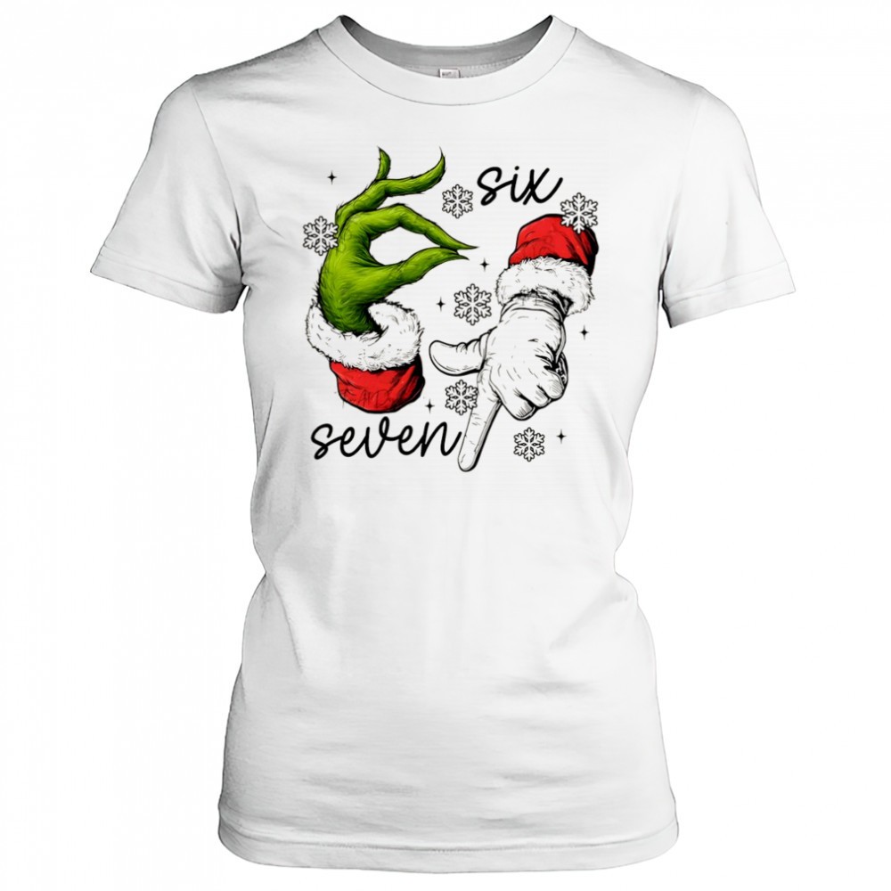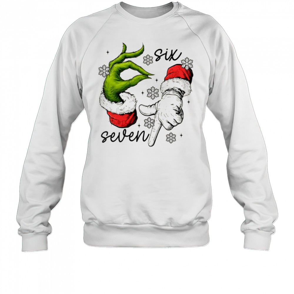 Grinch and Santa Claus hand trending six seven meme Merry Christmas shirt