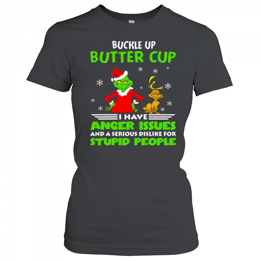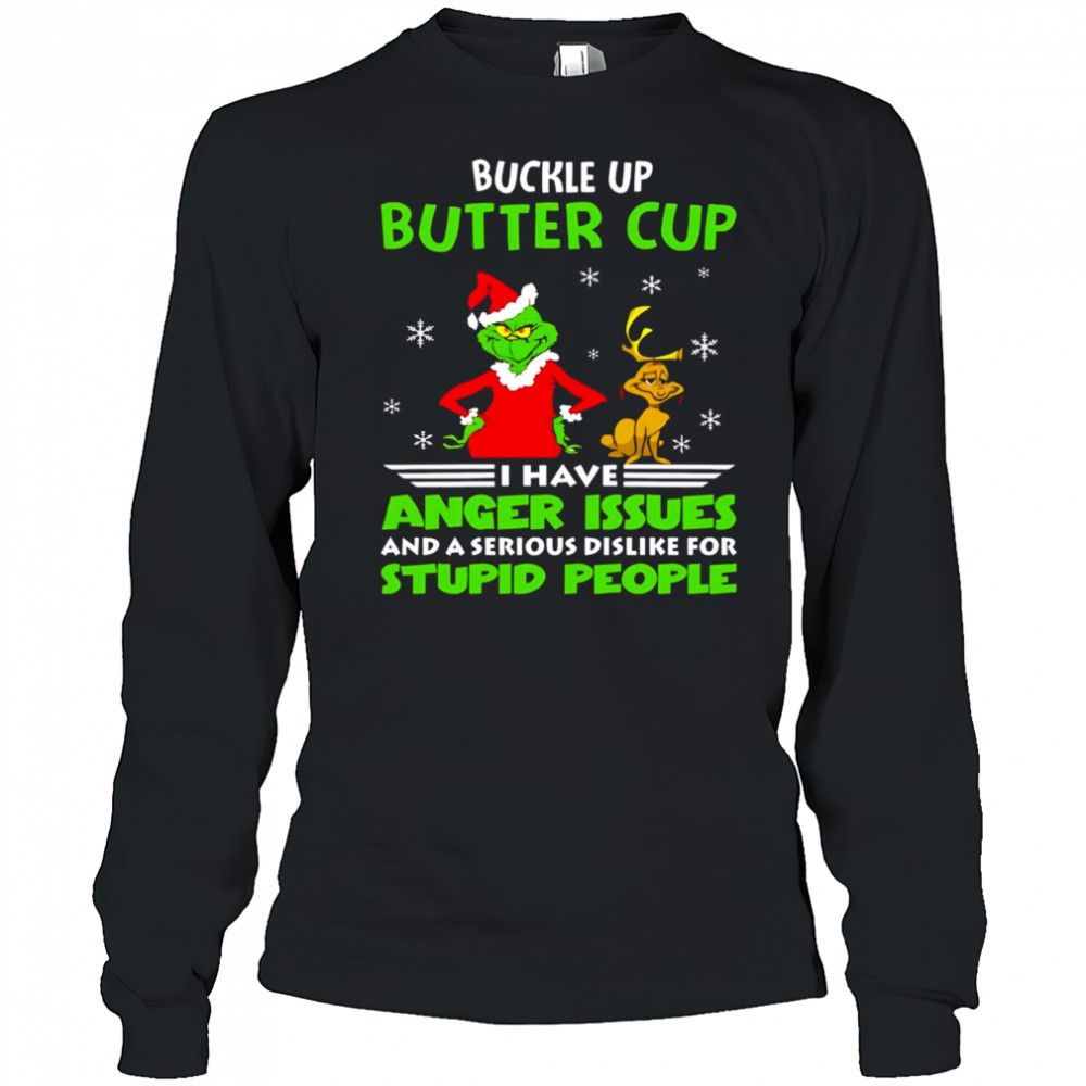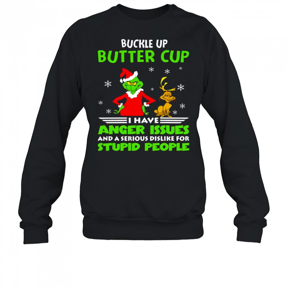 Grinch buckle up butter cup I have anger issues and a serious dislike for stupid people christmas shirt
