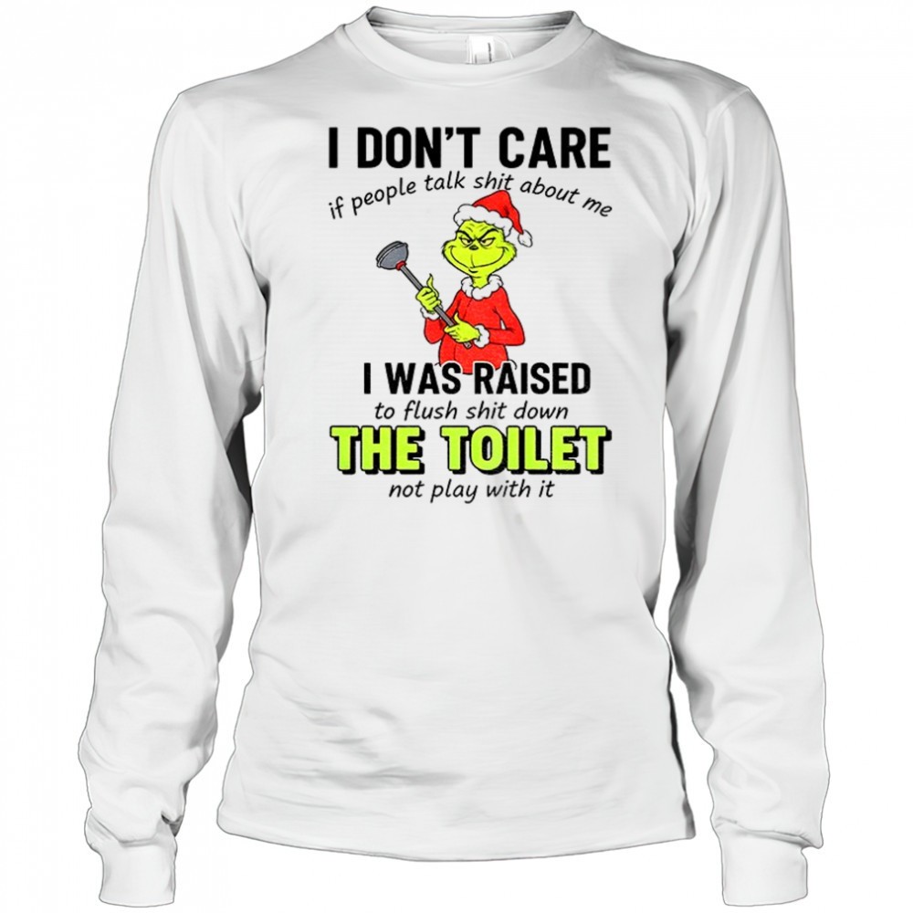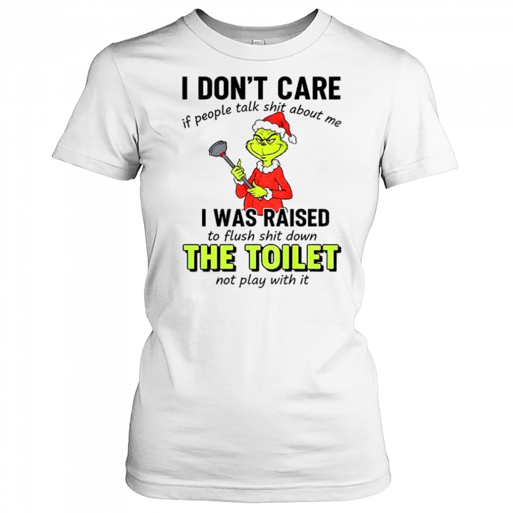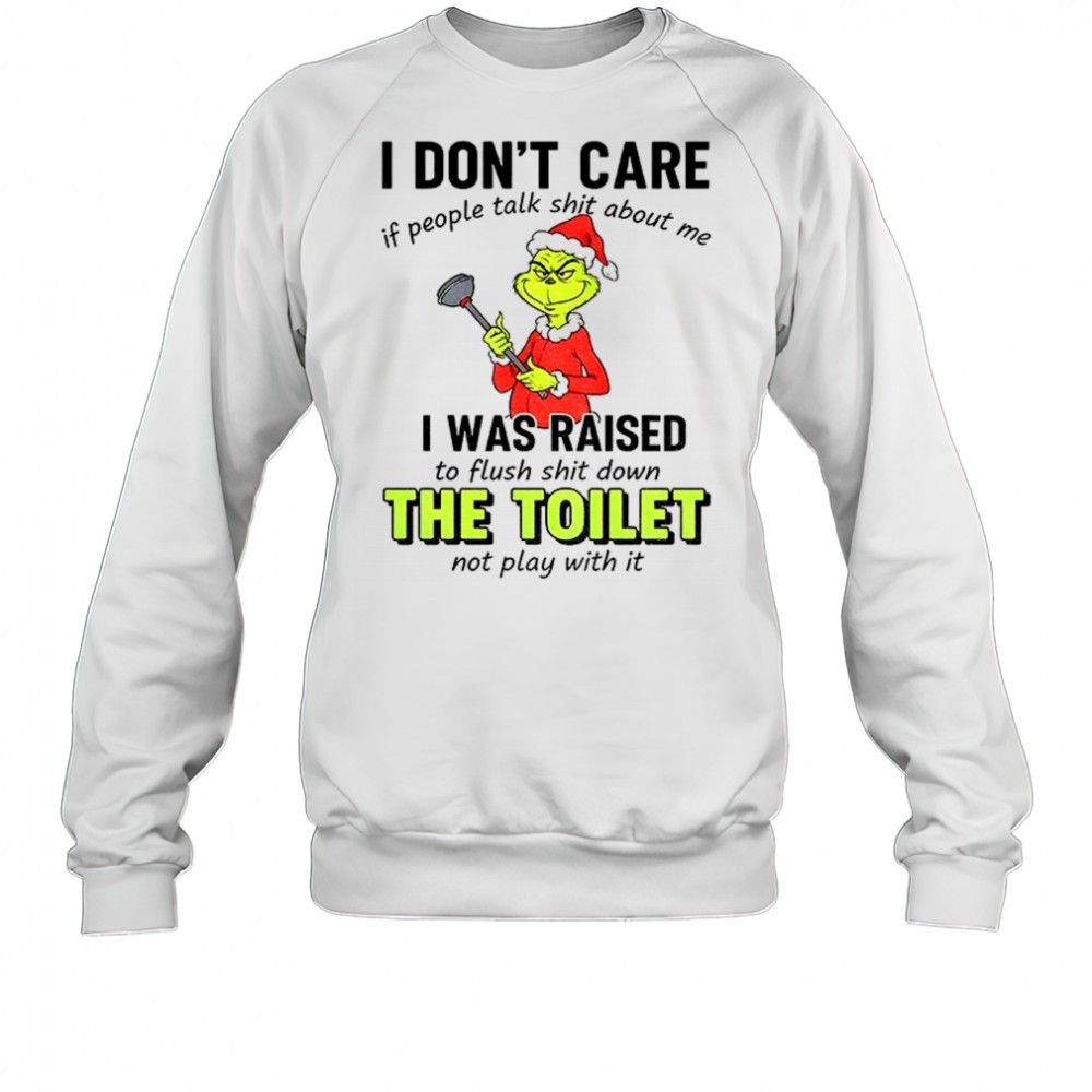 Grinch I dont care if people tałk shit about me I was raised to flush shit down the toilet not play with it Christmas shirt
