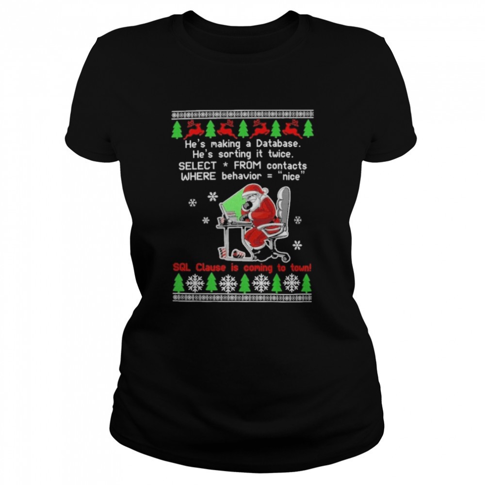 Santa Claus hes making database hes sorting it twice select from contacts where behavior nice Ugly Christmas shirt