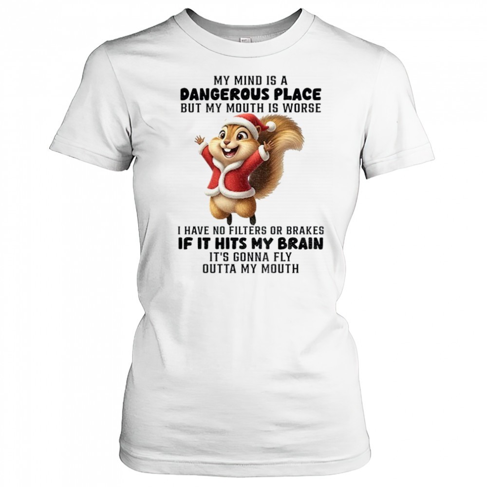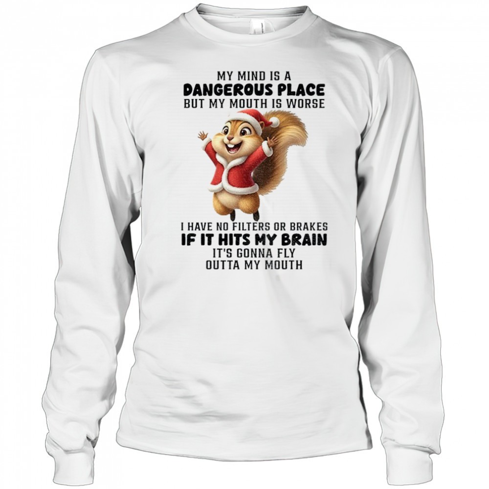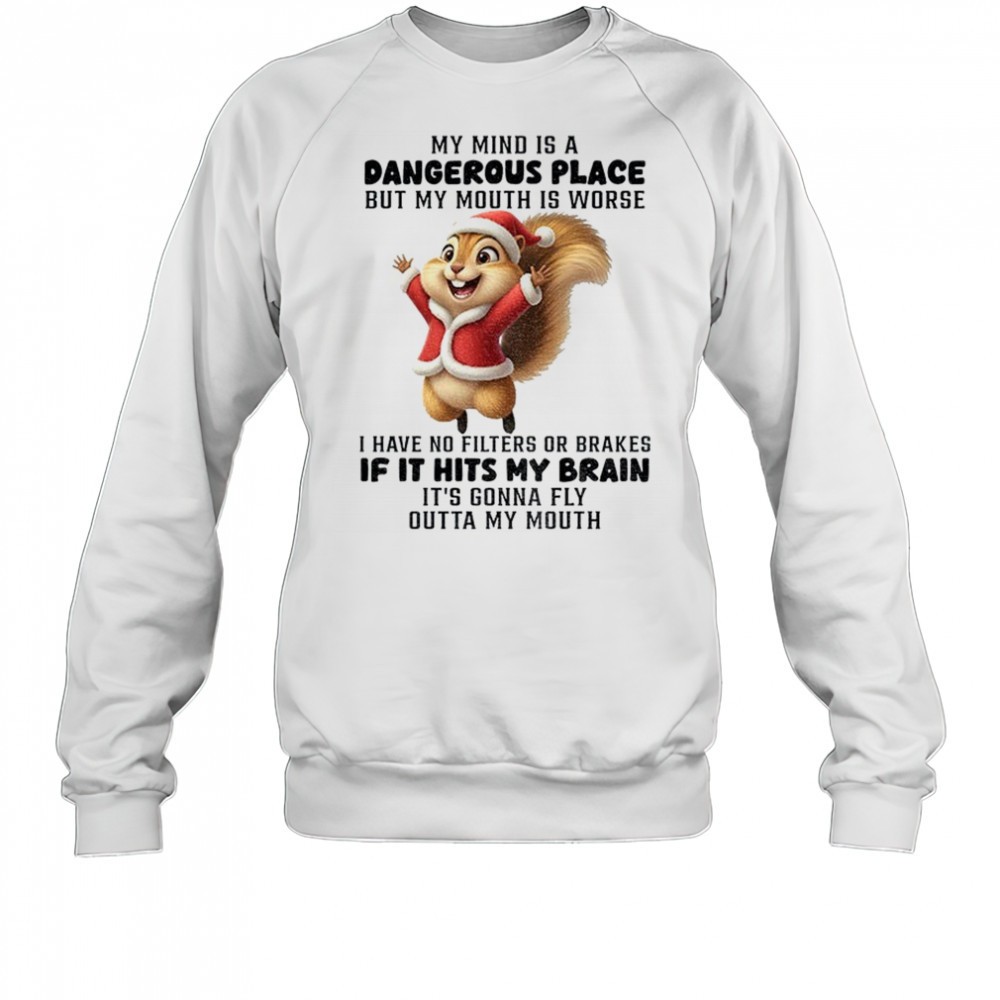 Squirrel Santa hat my mind is a dangerous place but my mouth is worse I have no filters or brakes Christmas shirt