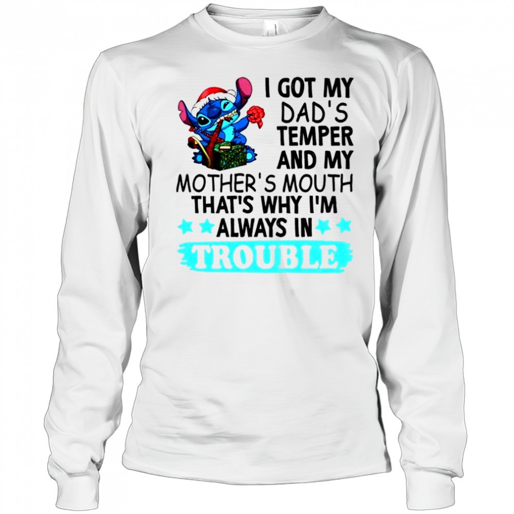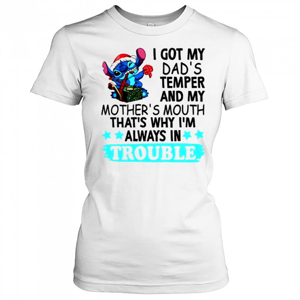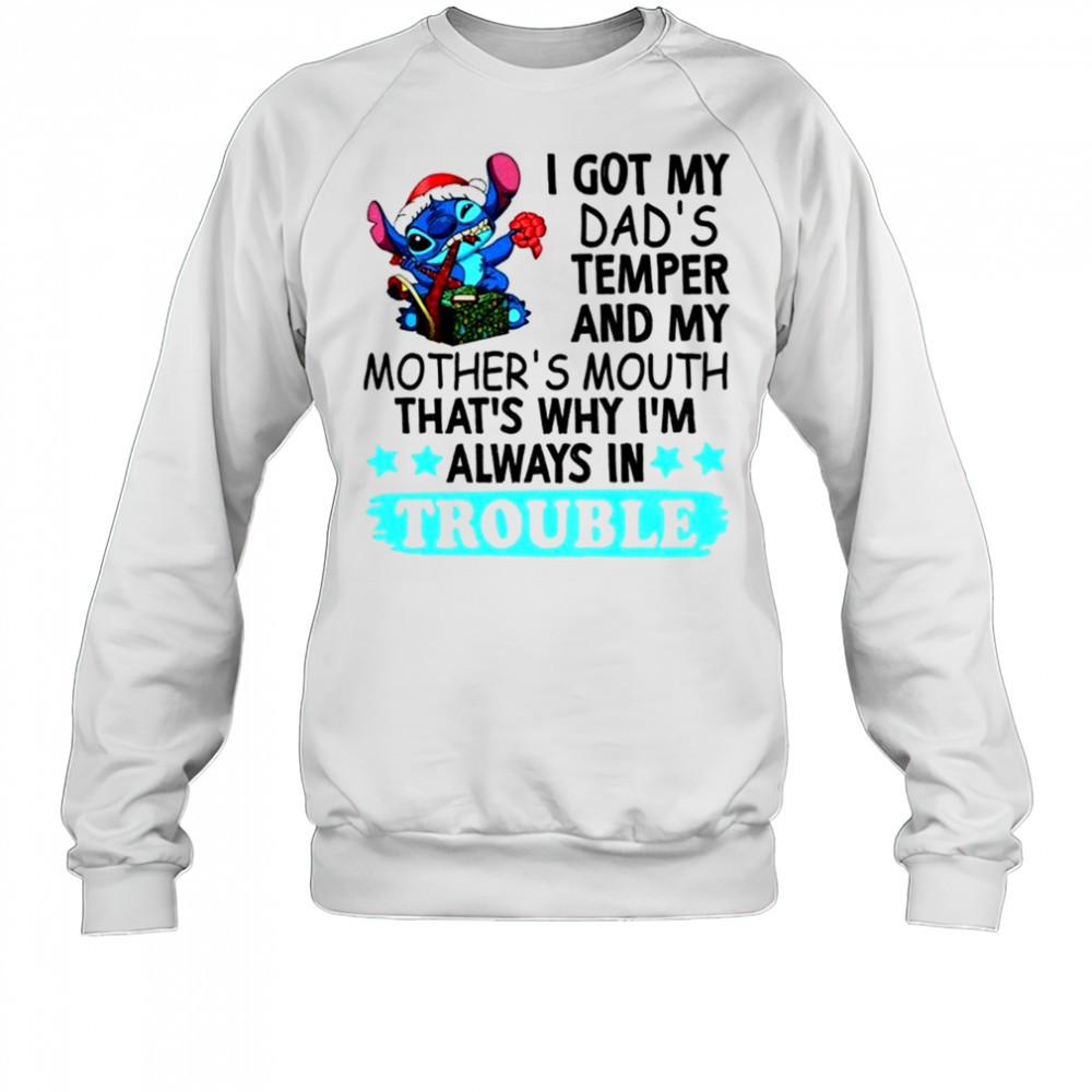 Stitch I got my dads temper and my mothers mouth thats why Im always in trouble Christmas shirt