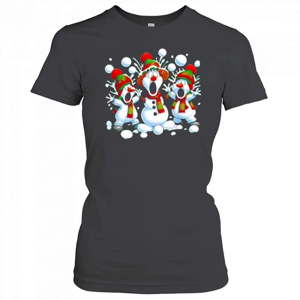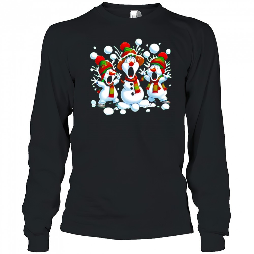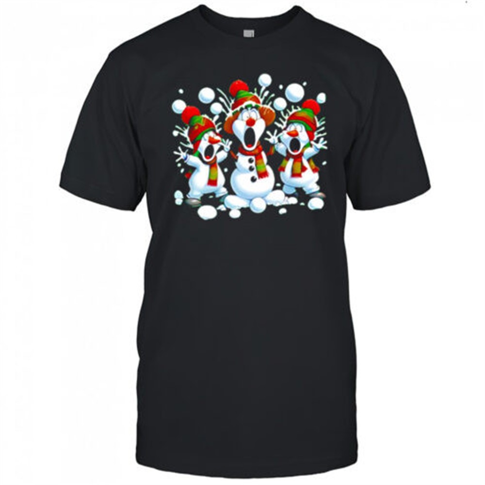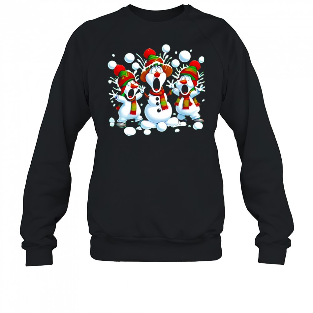 Three cartoon snowmen wearing Christmas hats and scarves shirt